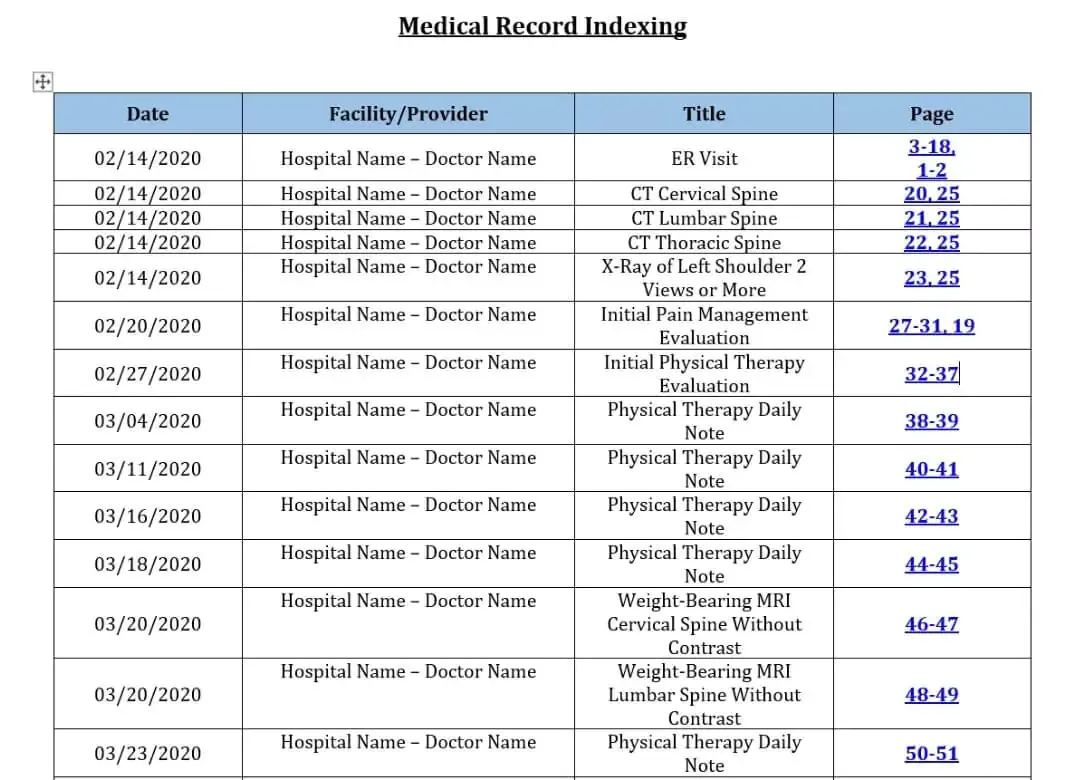 What is indexing in medical records? Medical record indexing is the process of rearranging and sorting the shuffled medical record into an organized, easily readable document. Indexing will be done as per the interest of the Attorney.