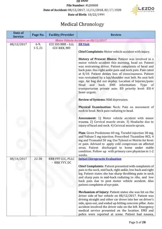 A medical record review sample gives a structured summary of a patient’s medical history, treatments, diagnoses, and key events extracted from their medical records. It shows how information is organized clearly and concisely to support legal, insurance, or clinical decisions.