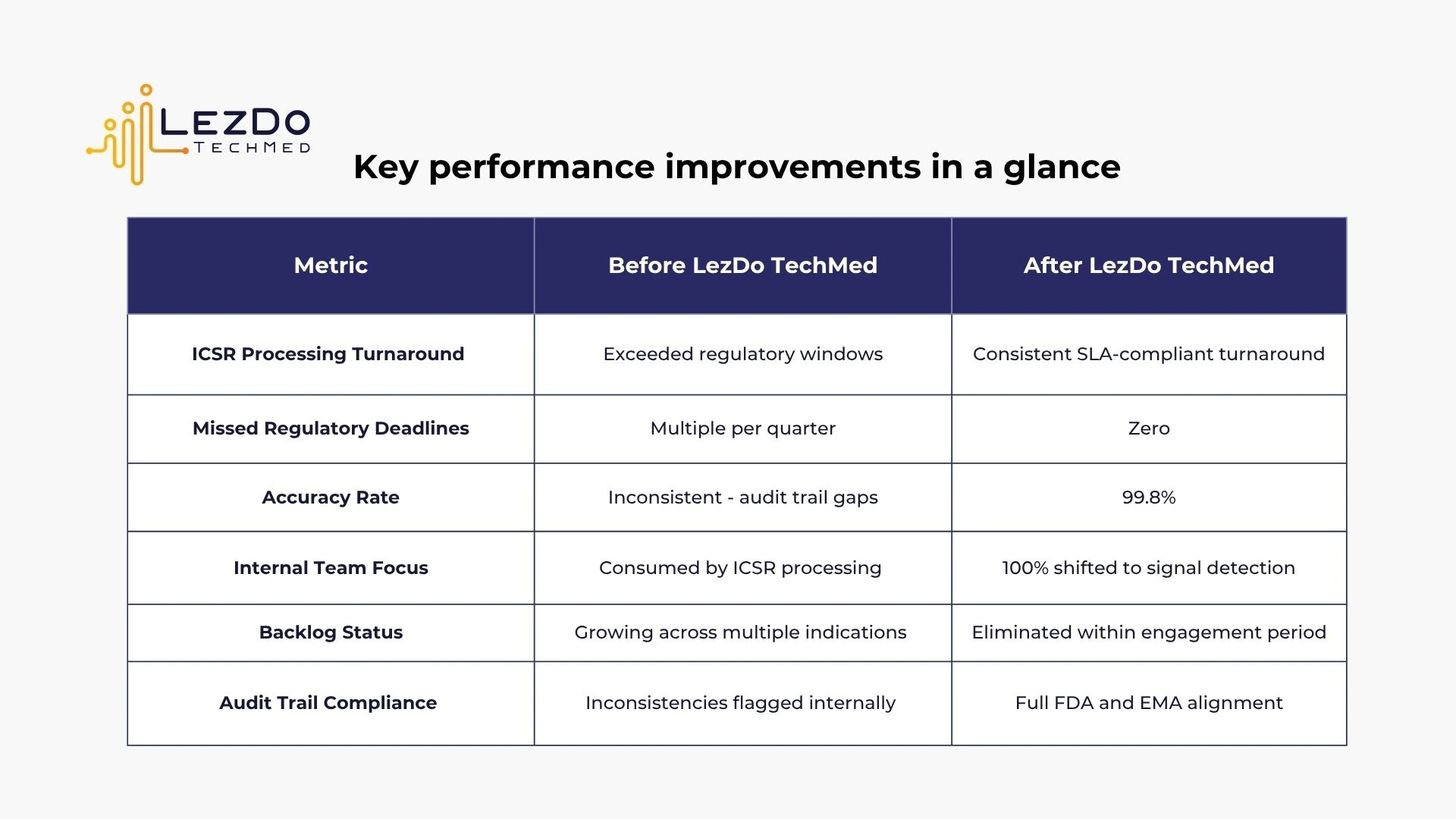 With LezDo TechMed’s support, the client transformed its ICSR operations from a backlog-driven process into a streamlined workflow. The result was a complete shift toward proactive pharmacovigilance and better patient safety outcomes.